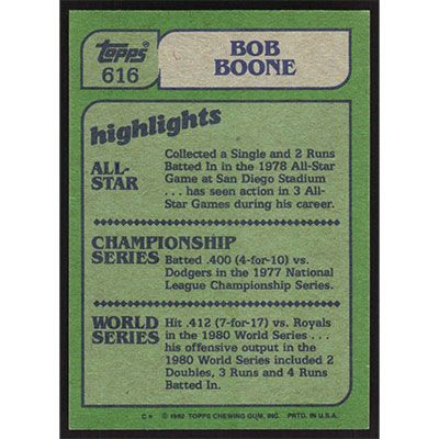This is a 1982 Topps Bob Boone In Action baseball card. The card is #616 and pictures show condition.