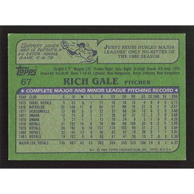 This is a 1982 Topps Rich Gale baseball card. The card is #67 and pictures show condition.
