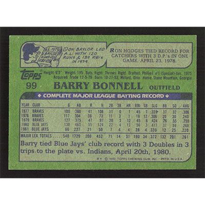 This is a 1982 Topps Barry Bonnell baseball card. The card is #99 and pictures show condition.