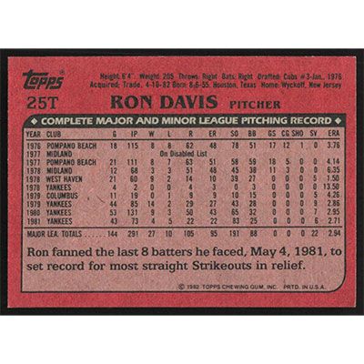This is a 1982 Topps Traded Ron Davis baseball card. The card is #25T and pictures show condition.