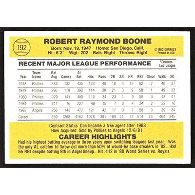 This is a 1983 Donruss Bob Boone baseball card. The card is #192 and pictures show condition.