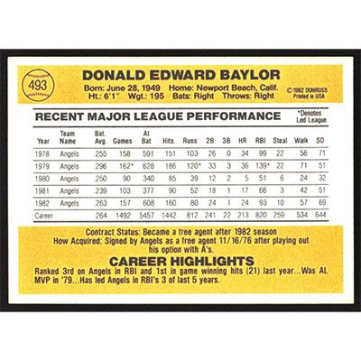 This is a 1983 Donruss Don Baylor baseball card. The card is #493 and pictures show condition.