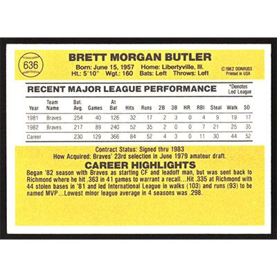 This is a 1983 Donruss Brett Butler baseball card. The card is #636 and pictures show condition.