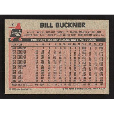 This is a 1983 Drake's Bill Buckner baseball card. The card is #2 and pictures show condition.