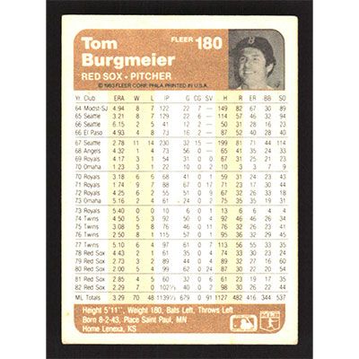 This is a 1983 Fleer Tom Burgmeier baseball card. The card is #180 and pictures show condition.