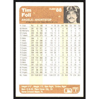 This is a 1983 Fleer Tim Foli baseball card. The card is #88 and pictures show condition.