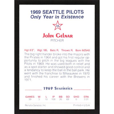 This is a 1983 Galasso '69 Pilots John Gelnar baseball card. The card is #18 and pictures show condition.