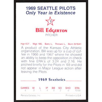 This is a 1983 Galasso '69 Pilots Bill Edgerton baseball card. The card is #3 and pictures show condition.