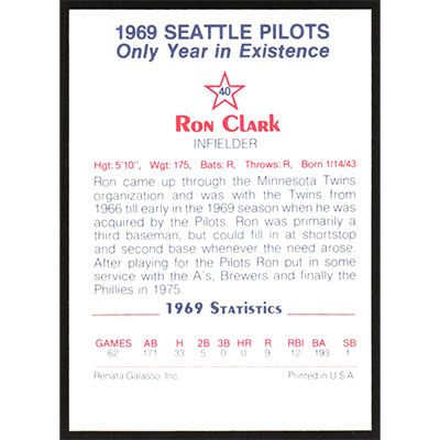 This is a 1983 Galasso '69 Pilots Ron Clark baseball card. The card is #40 and pictures show condition.