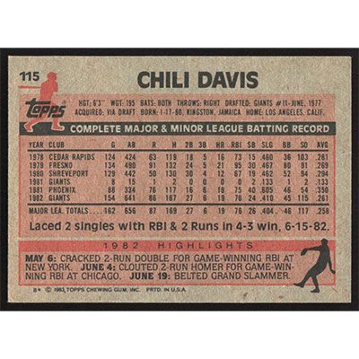 This is a 1983 Topps Chili Davis baseball card. The card is #115 and pictures show condition.