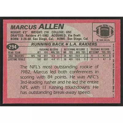 This is a 1983 Topps Marcus Allen Pro Bowl football card. The card is #294 and pictures show condition.