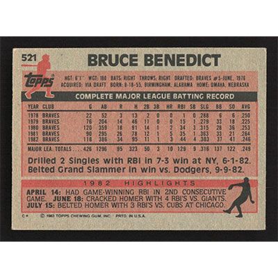 This is a 1983 Topps Bruce Benedict autographed baseball card. This card has been signed, in blue, by Bruce Benedict, and is guaranteed authentic by Ballcardz.com. The card is #521 and pictures show condition.