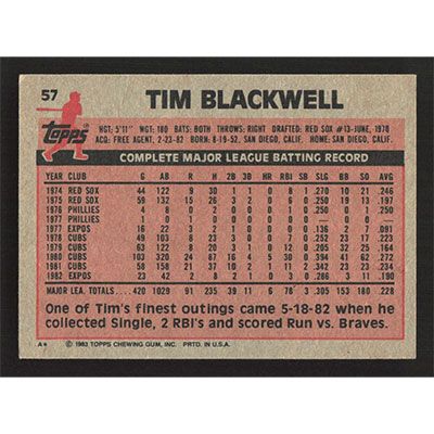 This is a 1983 Topps Tim Blackwell baseball card. The card is #57 and pictures show condition.
