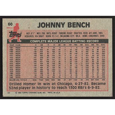 This is a 1983 Topps Johnny Bench baseball card. The card is #60 and pictures show condition.