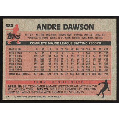 This is a 1983 Topps Andre Dawson baseball card. The card is #680 and pictures show condition.