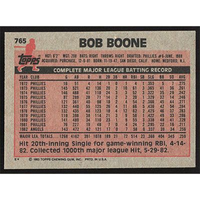 This is a 1983 Topps Bob Boone baseball card. The card is #765 and pictures show condition.