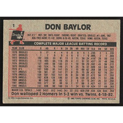 This is a 1983 Topps Drake's Big Hitters Don Baylor baseball card. The card is #1 and pictures show condition.