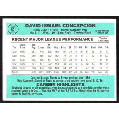 This is a 1984 Donruss Dave Concepcion baseball card. The card is #121 and pictures show condition.