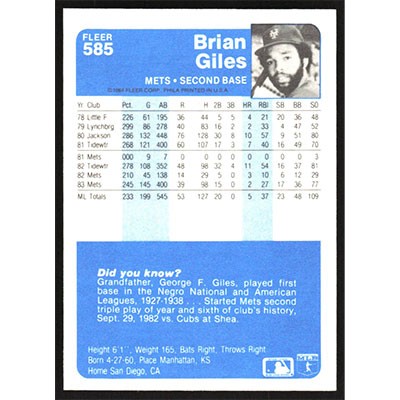 This is a 1984 Fleer Brian Giles baseball card. The card is #585 and pictures show condition.