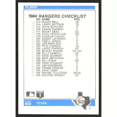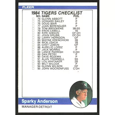 This is a 1984 Fleer Sparky Anderson Team Checklist baseball card. The card is #650 and pictures show condition. Team(s): Detroit Tigers/Texas Rangers