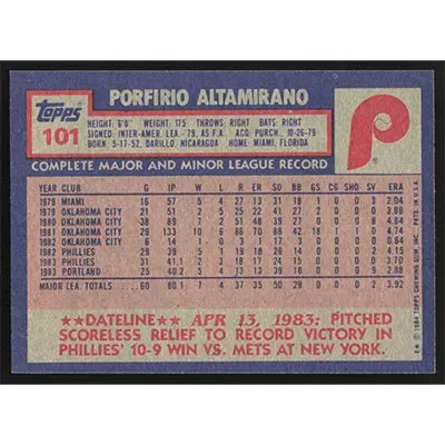 This is a 1984 Topps Porfirio Altamirano baseball card. The card is #101 and pictures show condition.