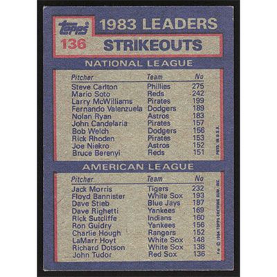 This is a 1984 Topps Steve Carlton and Jack Morris League Leaders baseball card. The card is #136 and pictures show condition. Team(s): Philadelphia Phillies/Detroit Tigers