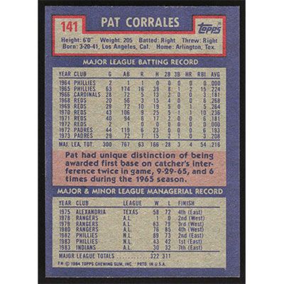 This is a 1984 Topps Pat Corrales baseball card. The card is #141 and pictures show condition.