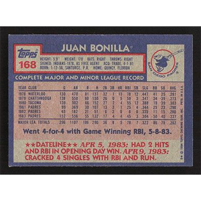 This is a 1984 Topps Juan Bonilla baseball card. The card is #168 and pictures show condition.