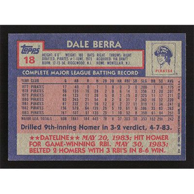This is a 1984 Topps Dale Berra baseball card. The card is #18 and pictures show condition.