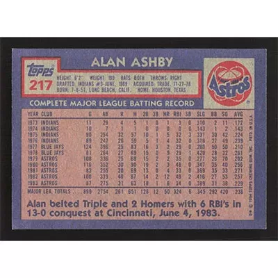 This is a 1984 Topps Alan Ashby baseball card. The card is #217 and pictures show condition.