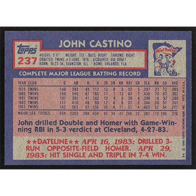This is a 1984 Topps John Castino baseball card. The card is #237 and pictures show condition.