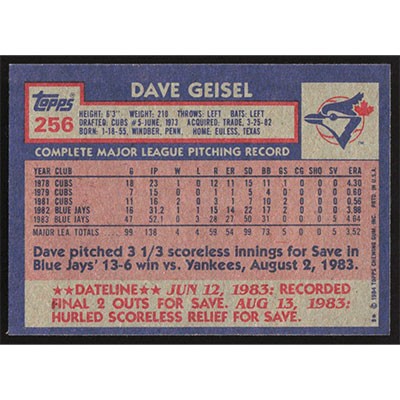 This is a 1984 Topps Dave Geisel baseball card. The card is #256 and pictures show condition.