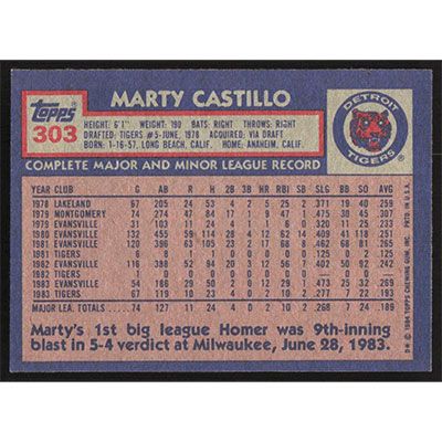 This is a 1984 Topps Marty Castillo baseball card. The card is #303 and pictures show condition.