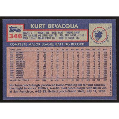 This is a 1984 Topps Kurt Bevacqua baseball card. The card is #346 and pictures show condition.