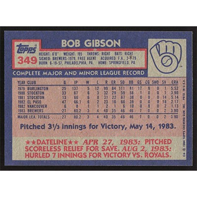 This is a 1984 Topps Bob Gibson baseball card. The card is #349 and pictures show condition.