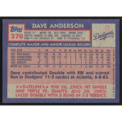 This is a 1984 Topps Dave Anderson baseball card. The card is #376 and pictures show condition.