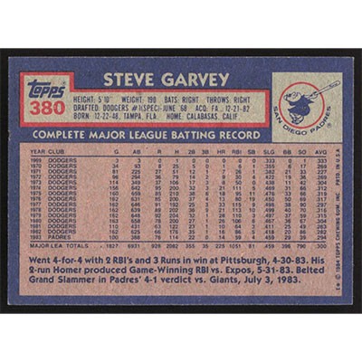 This is a 1984 Topps Steve Garvey baseball card. The card is #380 and pictures show condition.