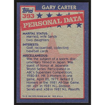 This is a 1984 Topps Gary Carter All-Star baseball card. The card is #393 and pictures show condition.