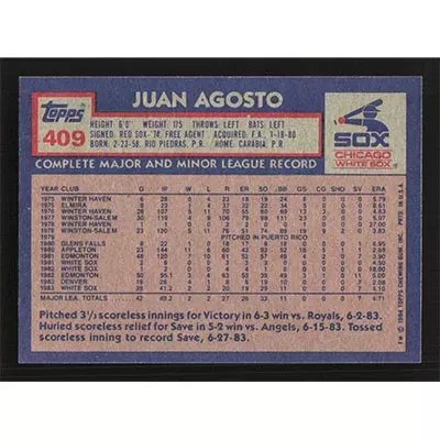 This is a 1984 Topps Juan Agosto baseball card. The card is #409 and pictures show condition.