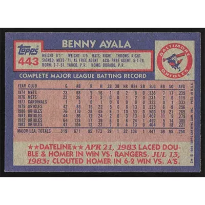 This is a 1984 Topps Benny Ayala baseball card. The card is #443 and pictures show condition.