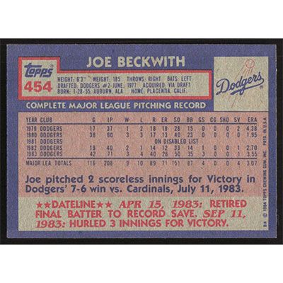 This is a 1984 Topps Joe Beckwith baseball card. The card is #454 and pictures show condition.