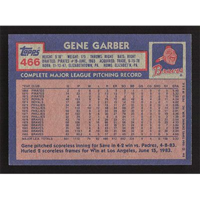 This is a 1984 Topps Gene Garber baseball card. The card is #466 and pictures show condition.
