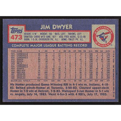 This is a 1984 Topps Jim Dwyer baseball card. The card is #473 and pictures show condition.