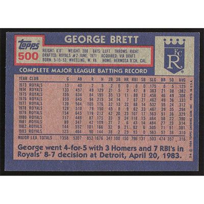 This is a 1984 Topps George Brett baseball card. The card is #500 and pictures show condition.