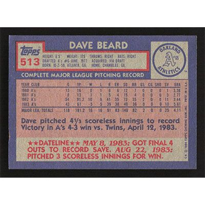 This is a 1984 Topps Dave Beard baseball card. The card is #513 and pictures show condition.
