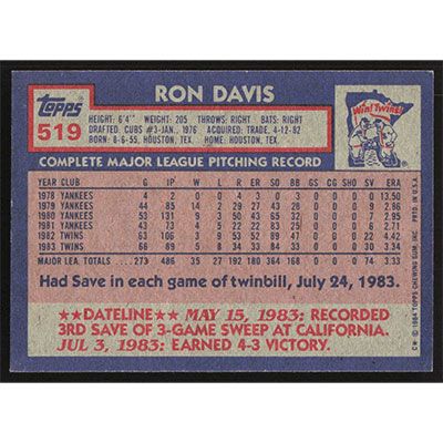 This is a 1984 Topps Ron Davis baseball card. The card is #519 and pictures show condition.