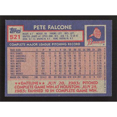 This is a 1984 Topps Pete Falcone baseball card. The card is #521 and pictures show condition.