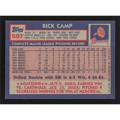 This is a 1984 Topps Rick Camp baseball card. The card is #597 and pictures show condition.