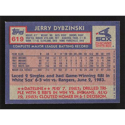 This is a 1984 Topps Jerry Dybzinski baseball card. The card is #619 and pictures show condition.