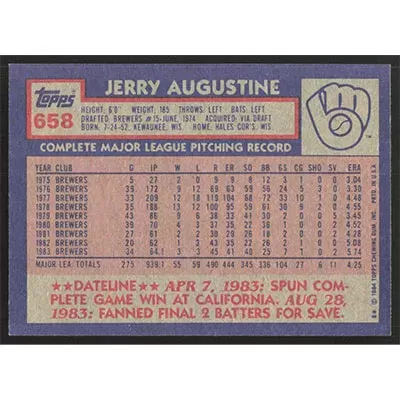 This is a 1984 Topps Jerry Augustine baseball card. The card is #658 and pictures show condition.